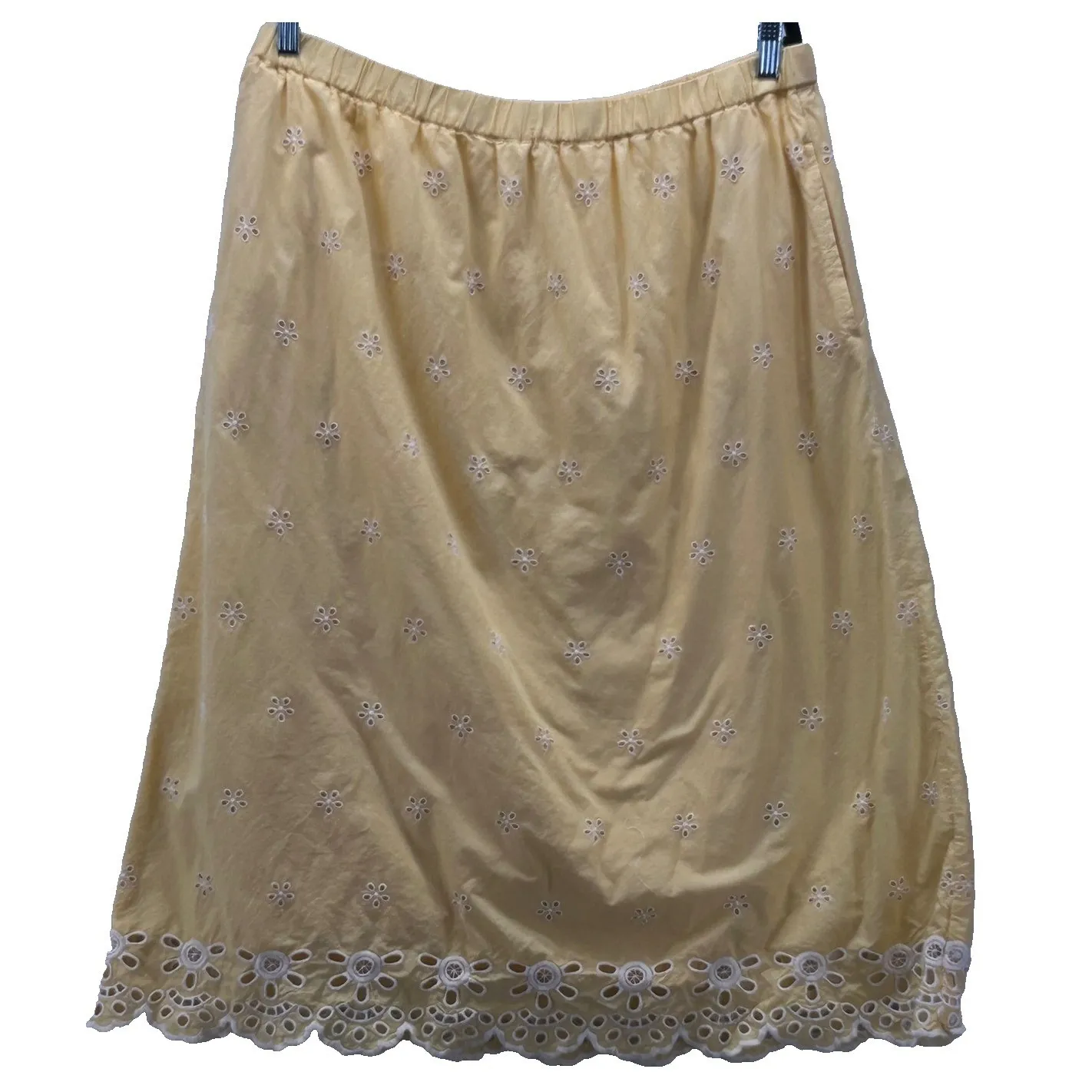 Discover effortless charm with this sunny yellow midi skirt, adorned with delicate white eyelet embr... Show more