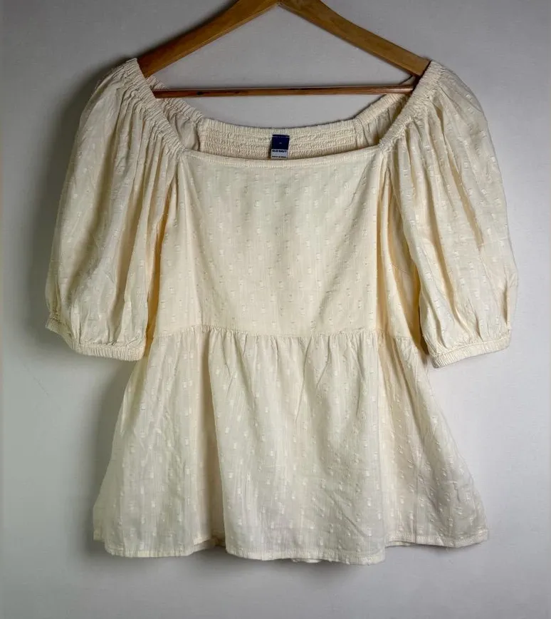 old navy blouse, smocked top, puff sleeve blouse, cottagecore top, coquette blouse, romantic peplum top, swiss dot blouse, square neck top, milkmaid style top, feminine blouse, ivory summer top, elastic smocked shirt, soft girl aesthetic, modern prairie top, boho romantic blouse