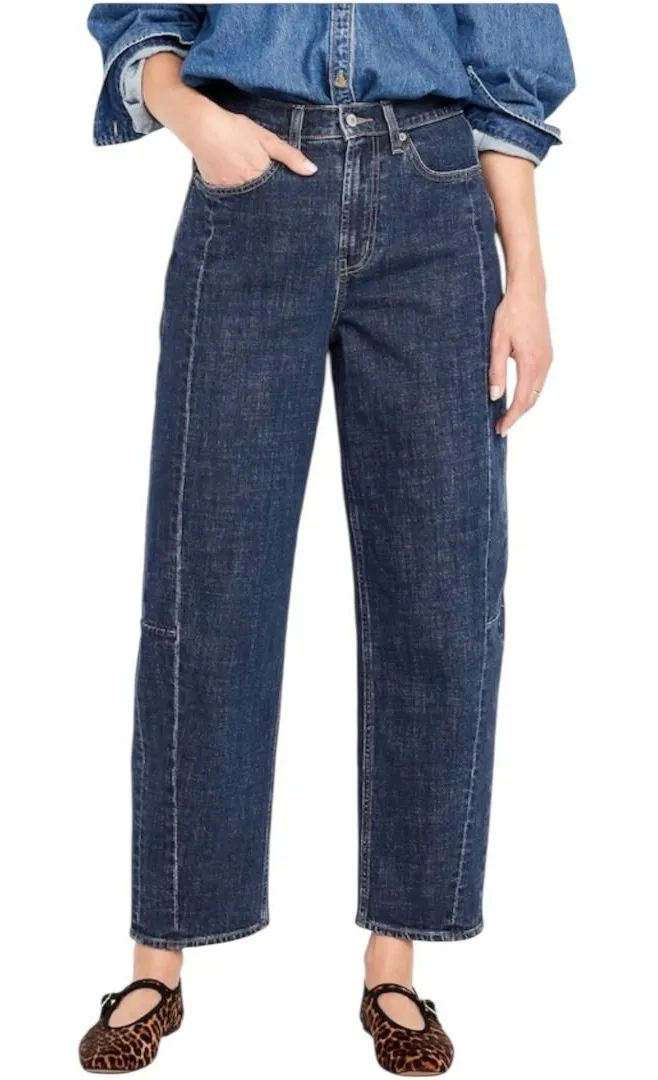 Old Navy Women's High Waisted Barrel Leg Ankle Jeans in Dark Wash Denim. Size 12. 99% cotton, 1% spa... Show more