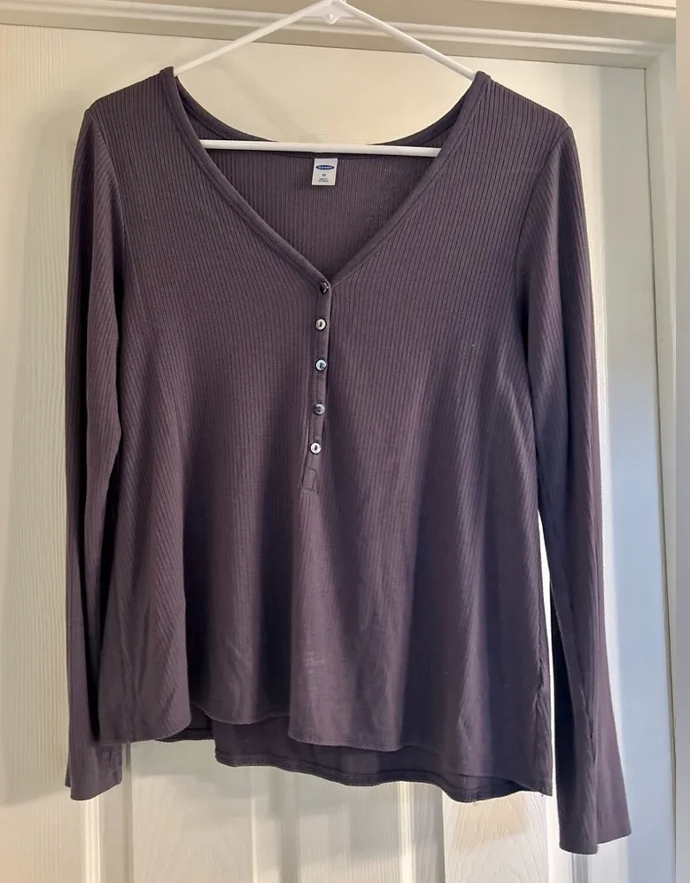 Chic long sleeve top with ribbed texture. Features a V-neck and button detail. Perfect for casual we... Show more