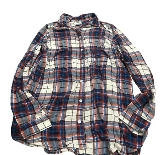 Stylish plaid button-down shirt. Features blue and red pattern. Perfect for casual outings.