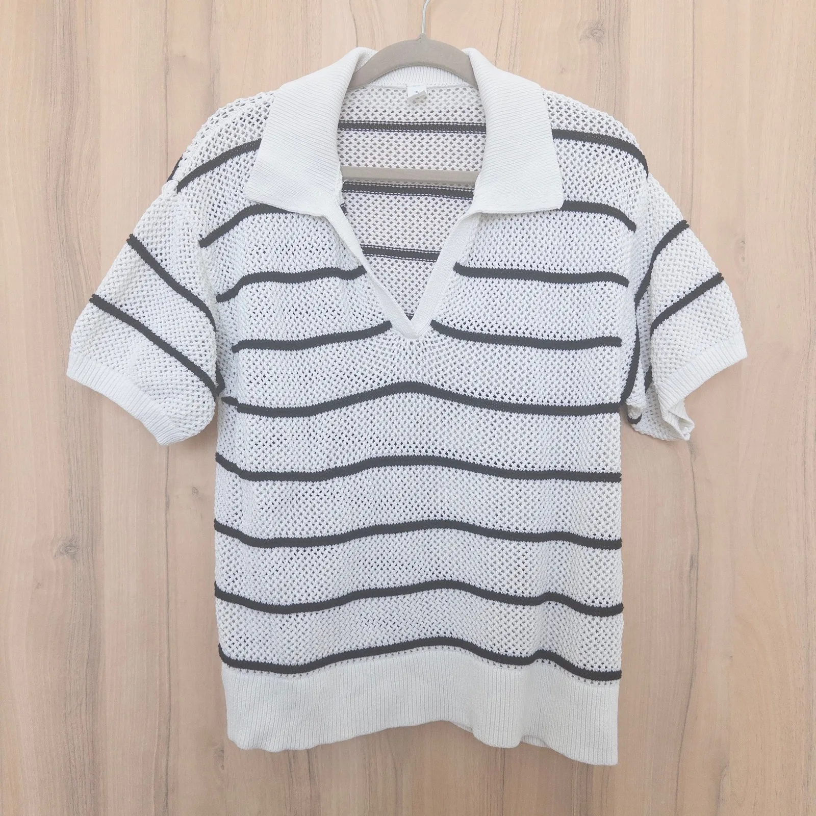 Old Navy women's short sleeve polo shirt in a striped mesh knit. This relaxed fit top features a cla... Show more