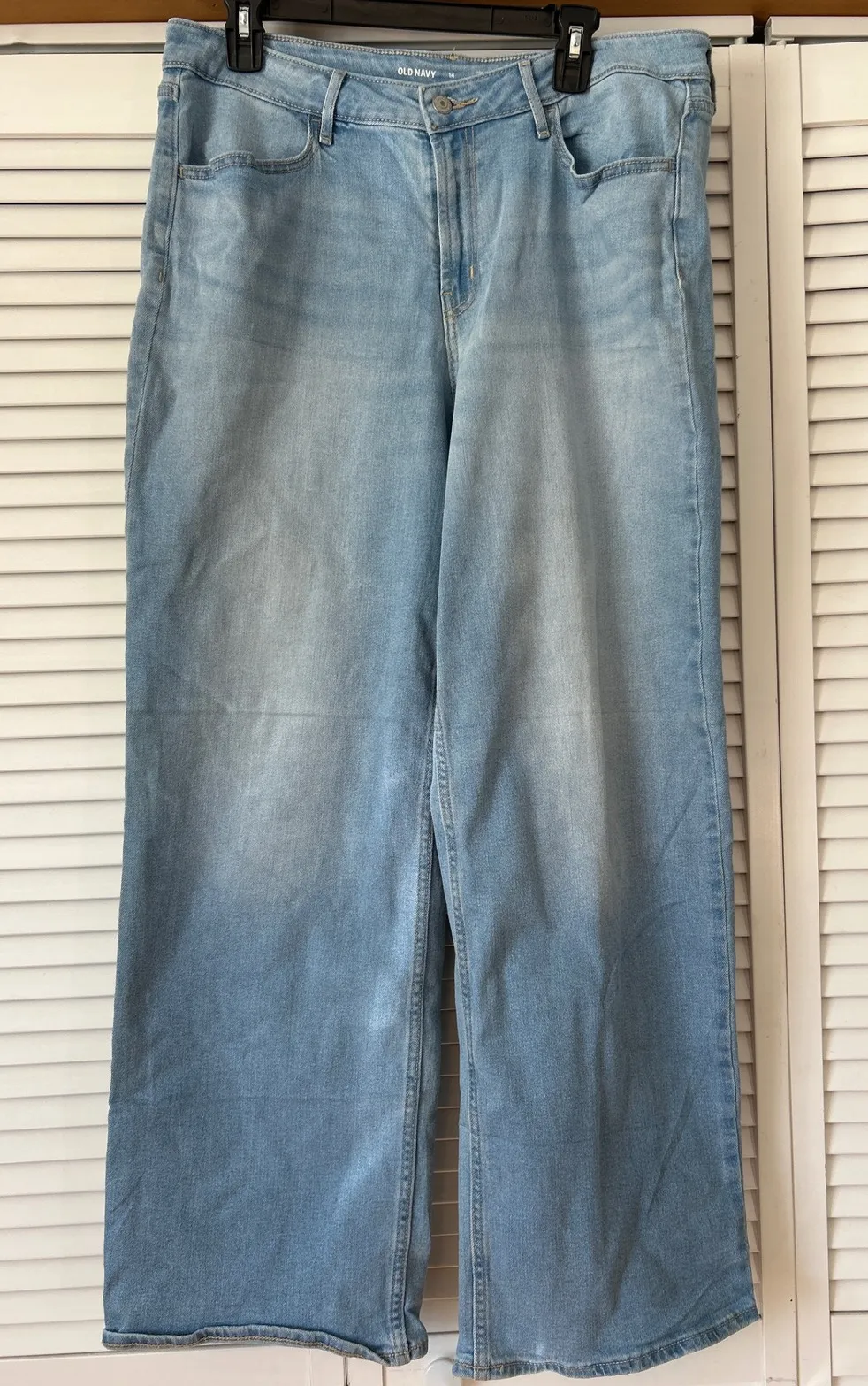 High rise wide leg light wash denim jeans. These jeans offer a comfortable and stylish silhouette w... Show more