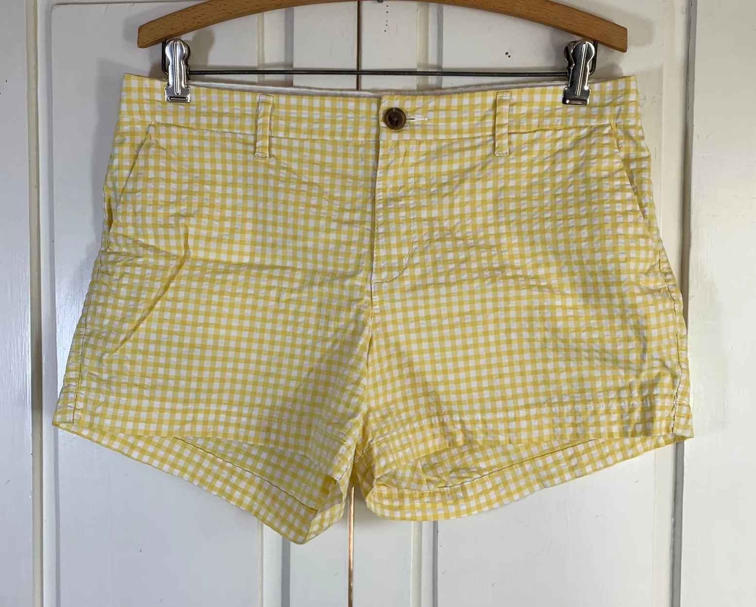Keywords: Old Navy shorts, yellow gingham shorts, seersucker shorts, women's shorts size 8, casual shorts, summer shorts, plaid shorts, everyday shorts, button fly shorts, belt loop shorts, textured shorts, lightweight shorts, picnic outfit, beachwear