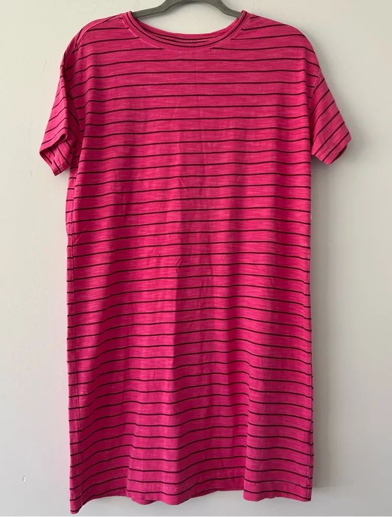 Casual pink t-shirt dress with maroon stripes. Dress has a boxy fit. Perfect for everyday wear. Bra... Show more