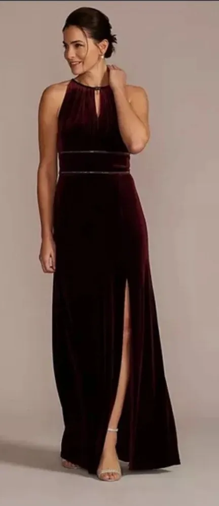 This is a new, burgundy velvet dress with tags and in its original box. The floor-length dress features a halter neckline with a keyhole opening, a fitted bodice, and a front slit. It has silver embellishments at the waist. The material is soft velvet. The dress is approximately 58 inches long. There is a small imperfection inside the neckline (see image). No other visible flaws