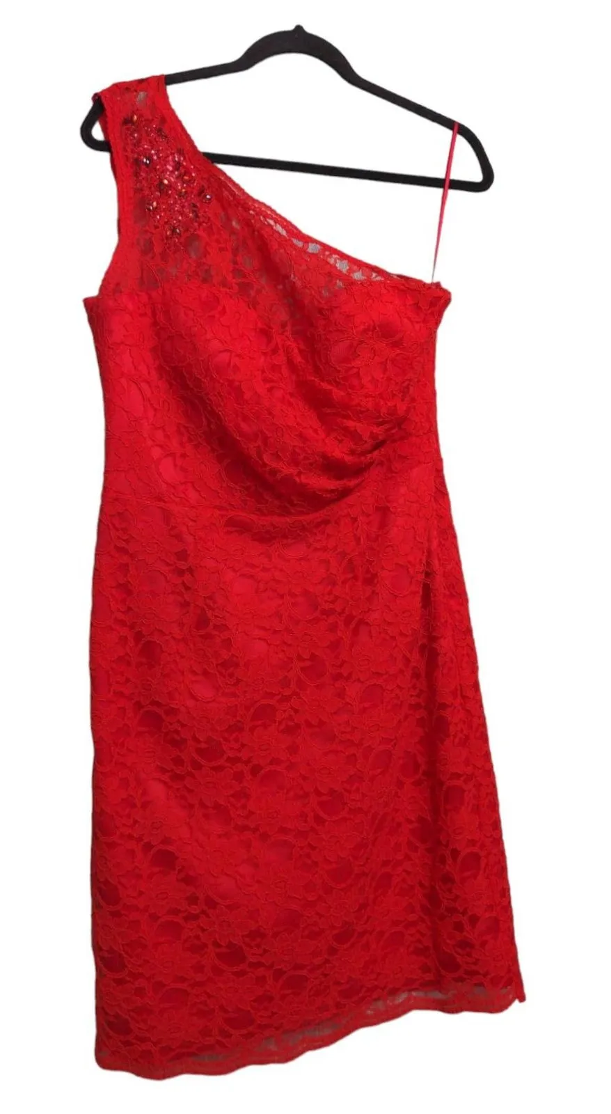 Oleg Cassini Womens Sheath Dress Red One Shoulder Sleeveless Lace Party Cocktail Formal 8 Brand: Oleg Cassini Size: 8 Style: Cocktail Dress Material: Nylon / Cotton Blend Accents: Beaded / Embellished / Lace Dress Length: Knee Length Color: Red Approximate measurements provided in photos