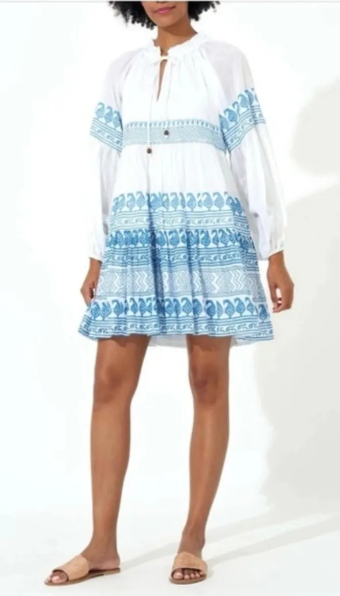 Oliphant's vacation-ready pieces are characterized by breezy silhouettes and vibrant colors. Santorini Floral Balloon Sleeve Short Dress, is begging for its moment in the sun! Look at those oceanic shades of blue- and that swingy, relaxed silhouette has us dreaming of a cool breeze off the water. Effortless and ultra-chic, this boho mini with a flowy tiered skirt is so versatile that it can be worn as a coverup by the beach, or as a casual dress with sandals and gold jewelry for sunny brunches and park hangs. Ruffle collar V-neckline Beaded ties at neckline Long balloon sleeves Pullover styling, no zipper Tiered skirt Mini length Relaxed, swingy fit Material: 100% Cotton Care: Wash cold and delicate with gentle detergent. Lay flat or hang dry. Light staining on hanging tie due to beads. There is the very slightest discoloration on the underside of sleeves. Measurements: • Chest: 20 in • Length: 33 in Style: Sundress, Shirt Dress Dress Length: Short Department: Women Sleeve Length: Long Sleeve Pattern: Geometric Occasion: Casual, Travel Material: 100% Cotton Fabric Type: Woven Theme: Tropical, Beach, Hippie Neckline: Round Neck Season: Summer, Spring Sleeve Type: Balloon Sleeve Keywords: Oliphant dress, paisley print, tiered dress, cotton dress, boho chic, gathered sleeves, ruffled neckline, drawstring, beaded details, casual dress, vacation wear, resortwear, summer dress, lightweight Ships fast from pet & smoke free home. offers welcome! Please review all photos.