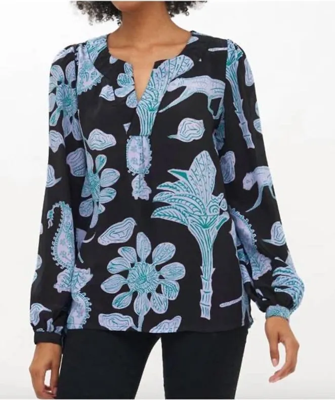 Oliphant Black Blue Paisley Cheetah Floral Print Split Neck Long Sleeve Blouse. Mixed print. 100% vi... Show more