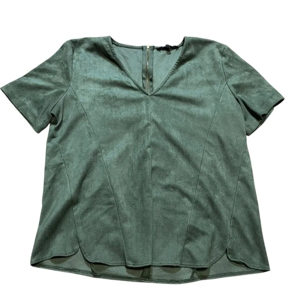 Olive green suede top exudes understated elegance with its flattering V-neck and chic short sleeves.... Show more