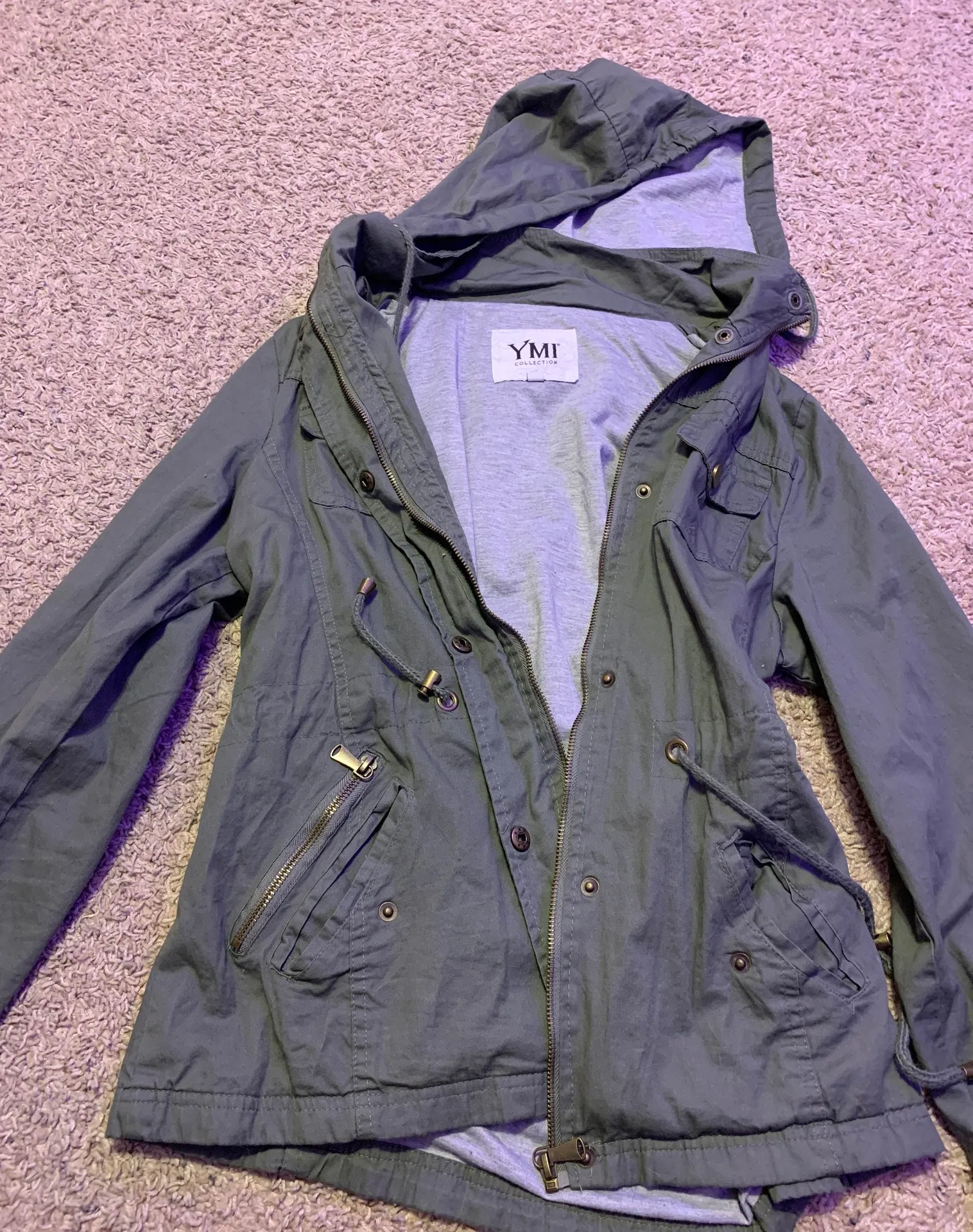 Super cute olive green jacket Has a zip on hood so you can wear it with a hood or without! Adjustable sinch around the waist if you want it Soft on the inside, perfect for colder weather