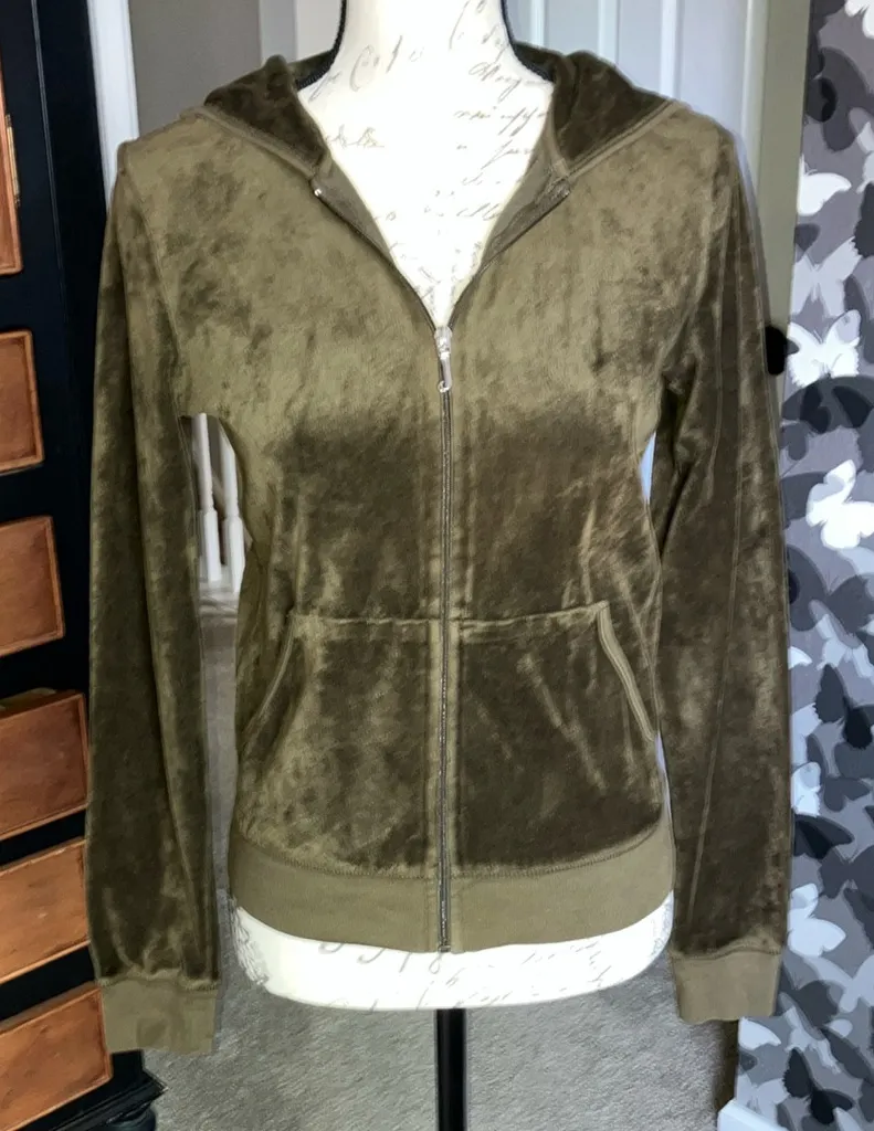 Stay cozy and stylish with this olive green velour hoodie jacket. Perfect for casual outings, this j... Show more