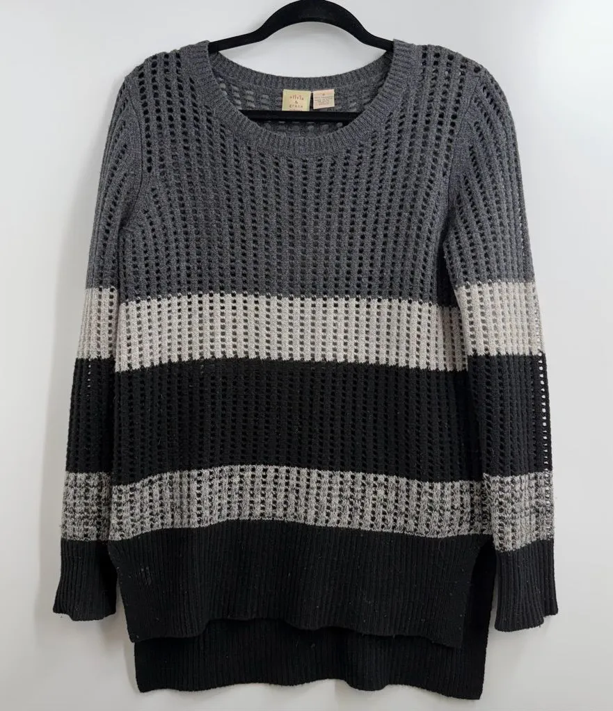 Overall good pre-owned condition, Light pilling and minor lint typical of cashmere wear, Small area of gunk that can probably be removed on lower ribbed hem (shown clearly in photos), No holes or structural damage noted approximate hand measurements pit to pit: 22" length: 30" Brand: Olivia & Grace Material: 100% Cashmere Size: Small (tagged) Color: Charcoal Gray, Light Gray, Black Made In: China Care: Dry Clean Only Style: Open-Knit Colorblock Pullover Sweater Neckline: Scoop / Bateau-style wide neck Sleeves: Long sleeve Hem: Ribbed with subtle stepped/uneven hem detail Fit: Relaxed Olivia & Grace sweater crafted from 100% cashmere. Features a breathable open-knit texture with modern horizontal colorblock stripes in charcoal gray, light gray, and black. Relaxed silhouette with a wide scoop neckline and ribbed hem and cuffs. perfect for layering in fall and winter or transitioning seasons cashmere sweater, open knit sweater, colorblock sweater, minimalist knitwear, luxury sweater, soft cashmere, capsule wardrobe, elevated basics, neutral sweater, cozy chic, lightweight knit, modern classic, slow fashion, Cashmere, Colorblock, Minimalist, Cozy, Luxe, Capsule Wardrobe