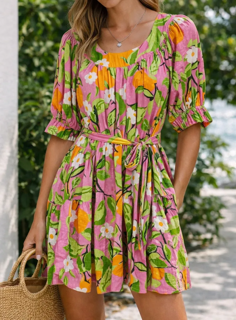 Olivia James dress in a pink base with green and yellow floral print. Wide scoop neckline with soft... Show more