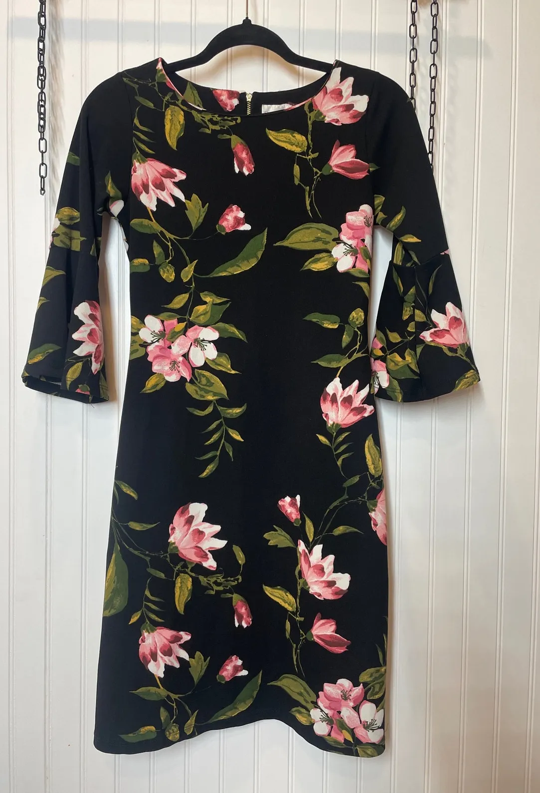 Black & Pink Floral Print 3/4 Length Bell Sleeves Crew Neckline Sheat Silhouette Mini Length Back Zipper Closure Size Small Measurements - See Pictures For Details - Excellent Condition - Smoke-free/pet-free House - Fast Shipper Tags: Floral, Flower, Botanical, Garden, Party, Cocktail, Feminine, Bridesmaid, Homecoming, Prom, Holidays, Elegant, Semi-Formal, Holiday, Wedding guest, Banquet, Event, Statement, Night Out