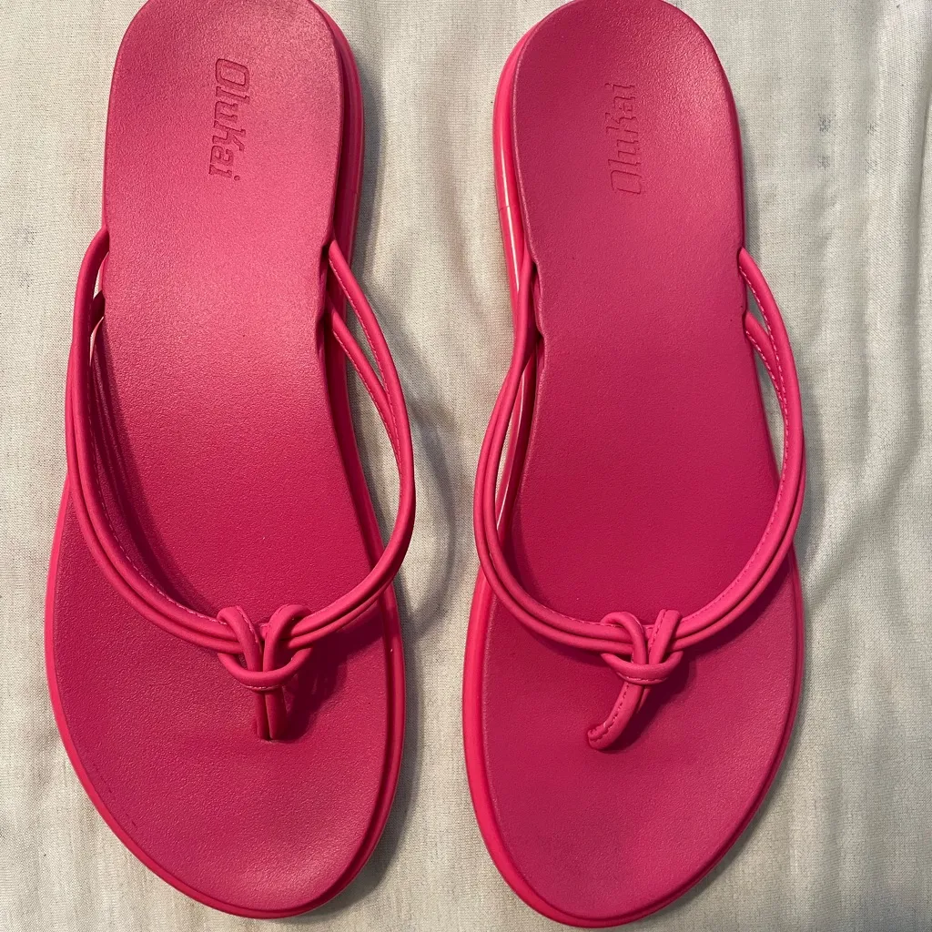 Bright pink OluKai sandals. Ideal for summer outings. In excellent/like new condition These fit like a size 9 but don’t have a size tag on the shoes. Please see measurements. I normally wear a 9 1/2 and these fit but I would be more comfortable in a size up