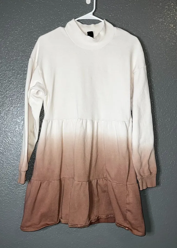 Trendy Wild Fable ombre sweatshirt dress featuring a cozy mock neck, long sleeves, and a cream-to-br... Show more