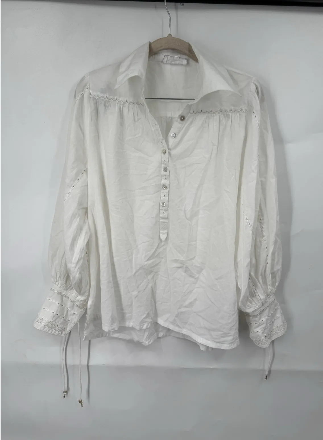 Good pre owned condition but has 2 small brown stains on the back. Size small. Balloon sleeve. Mother of pearl buttons. Has dainty embroidery. Tie sleeve cuffs. All measurements are approximate: 23 inches pit to pit. 17 inch sleeve from cuff to pit. 26 inch length from shoulder to bottom hem. U23