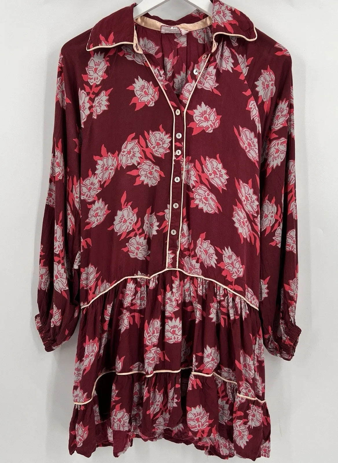 Omika Ezra Button Up Down Blouse Shirt Tunic Top Mini Dress in Isla Merlot Red Floral Print Long Sleeves Collared 100% Modal Viscose Made in India Women’s size XS. Missing belt and missing loop on one side (shown in photos) otherwise excellent used condition Approx measurements laid flat Pit to pit: 19.5 inches Full length: 34 inches