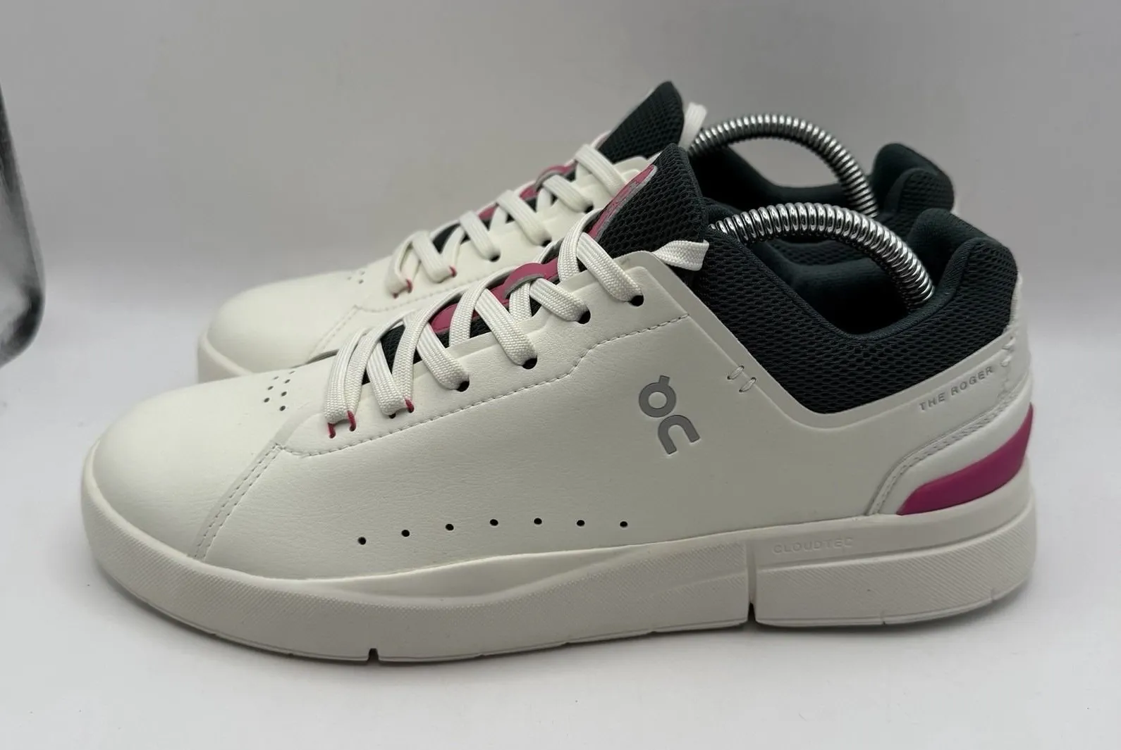 The On Cloud The Roger Advantage Ivory Pink Sneaker 3WD10652923 is a stylish and versatile athletic shoe designed for women in size 7.5. Featuring a lace-up closure, rubber outsole, and cushioned insole, this sneaker offers comfort and support for various activities like gym training, tennis, walking, and running. The white and pink color combination adds a feminine touch, making it suitable for casual wear, activewear, and even workwear. Made with leather upper material and polyester lining, this sneaker is durable and easy to care for. Whether it's winter, summer, fall, or spring, these sneakers are a practical and fashionable choice for any season.
