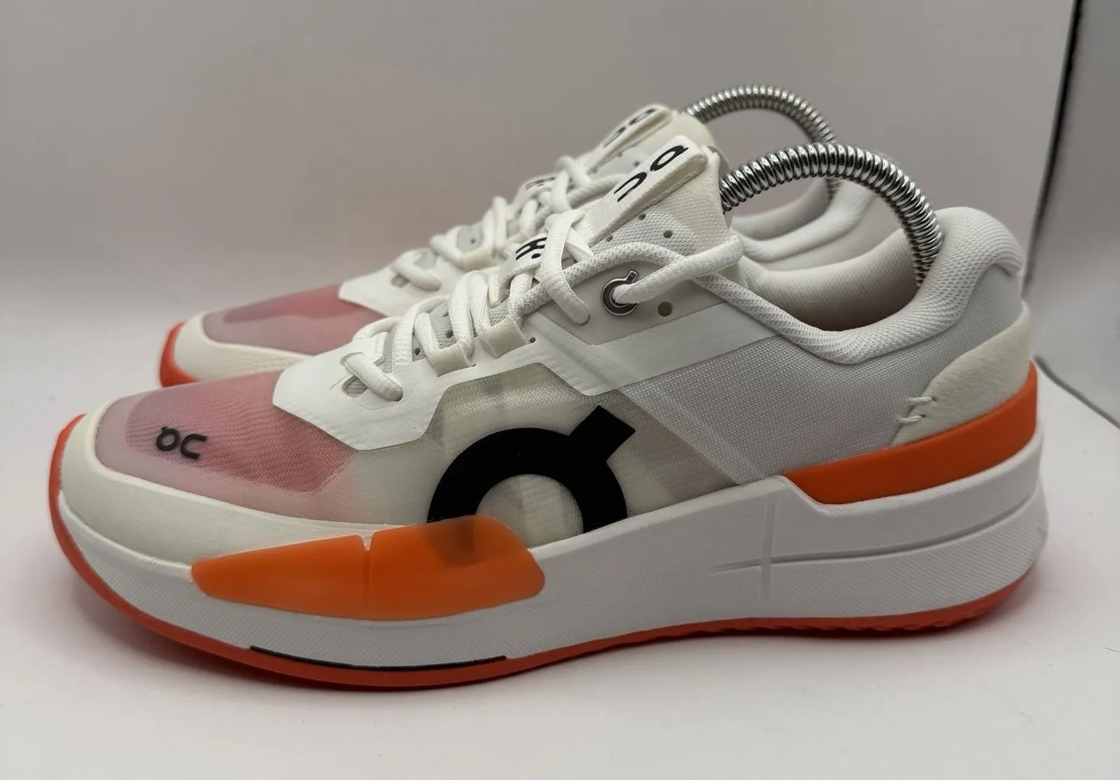 The On Cloud The Roger Pro 2 Tennis Shoe in size 9 for women features a white and flame color scheme... Show more