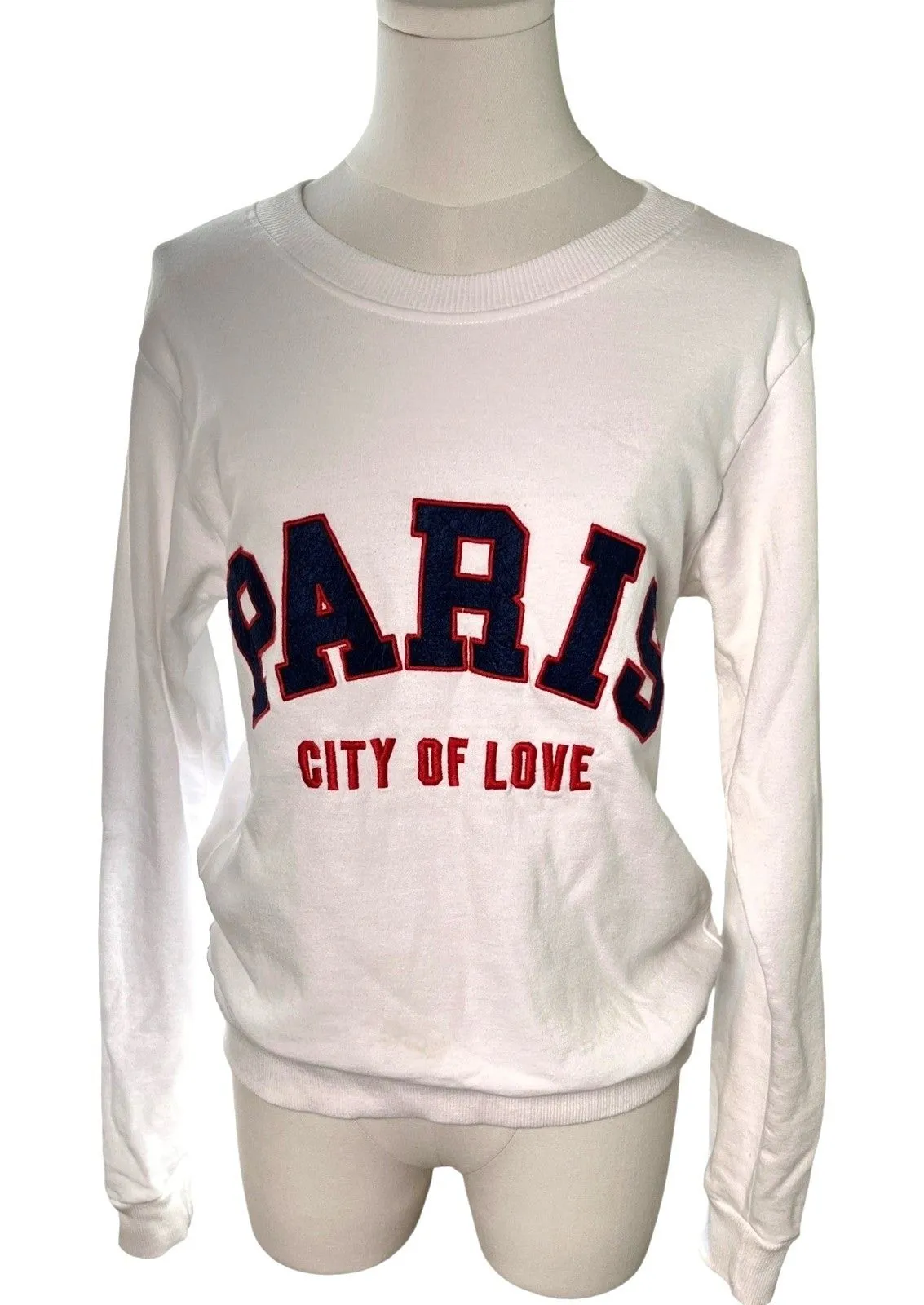 Cozy white cotton sweatshirt by On Fire, featuring bold PARIS CITY OF LOVE lettering in red and navy across the front. Classic crewneck pullover with ribbed cuffs and hem. Perfect for casual wear, layering, or travel style. Measurements (approx, flat): Pit to pit: 17.5" Length: 25" Sleeve length: 25" Fabric: 100% cotton. Condition: Pre-owned, gently worn. Parisian chic casual streetwear travel style collegiate graphic sweatshirt cozy cotton preppy casual