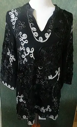 This stunning black top from Once Again features a beautiful embellished floral design that will elevate any outfit. Comfortable and stretchy fabric, this top is perfect for any occasion. Add a touch of elegance to your wardrobe with this unique and stylish tunic top.