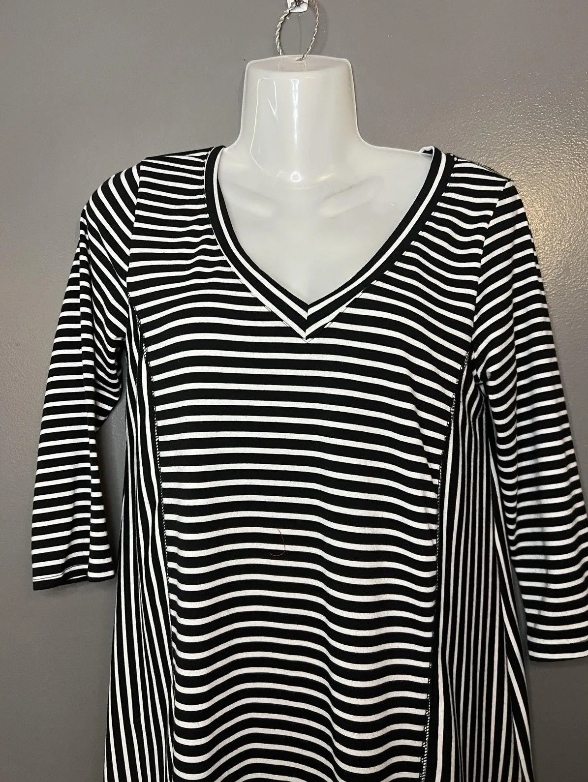 Gently worn with minimal wash wear; fabric remains clean and intact. No stains, holes, or stretched areas. Brand: One Clothing Los Angeles Style: Womens striped knit dress with V-neck front and 3/4 sleeves, featuring an A-line silhouette with mixed horizontal and vertical stripe panels. Color: Black and white stripe. Size on tag: Small. Materials: 100% rayon (per tag). Style code: GR4360 PK3; RN 97454; made in Mexico. Details: Soft stretch pullover knit, contrast stripe side panels, above-knee length, unlined and lightweight for comfortable everyday wear. PTP 18" has stretch Length 33" bin 4 2284