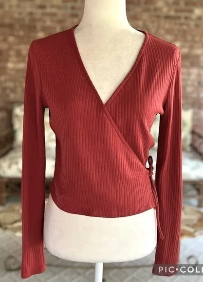 One Clothing Los Angeles Rust Brown Rubbed Wrap Top ~ large ribbed pattern with long sleeves ~ no m... Show more