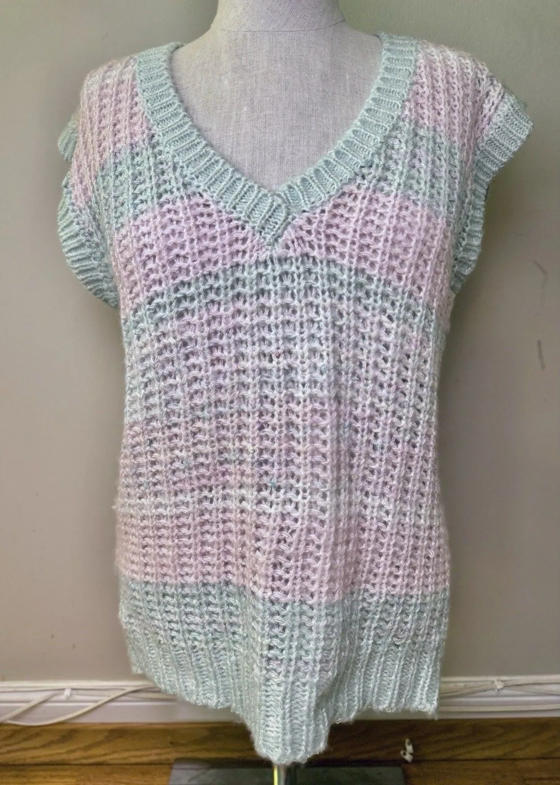 One Step Up Women's Crocheted Sleeveless V-neck Striped Top Vest. Color Pastel Pink-Pastel Green. Size Medium. Measurements (approx. laid flat) Pit to pit 18" Shoulder to hem 28" 56% RAMIE 41% ACRYLIC 3% COTTON