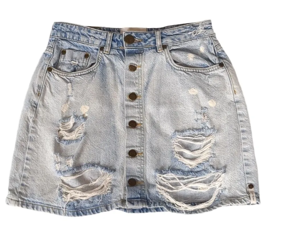 One teaspoon viper high button mini destructed denim skirt size 26 good used condition waist 27" le... Show more