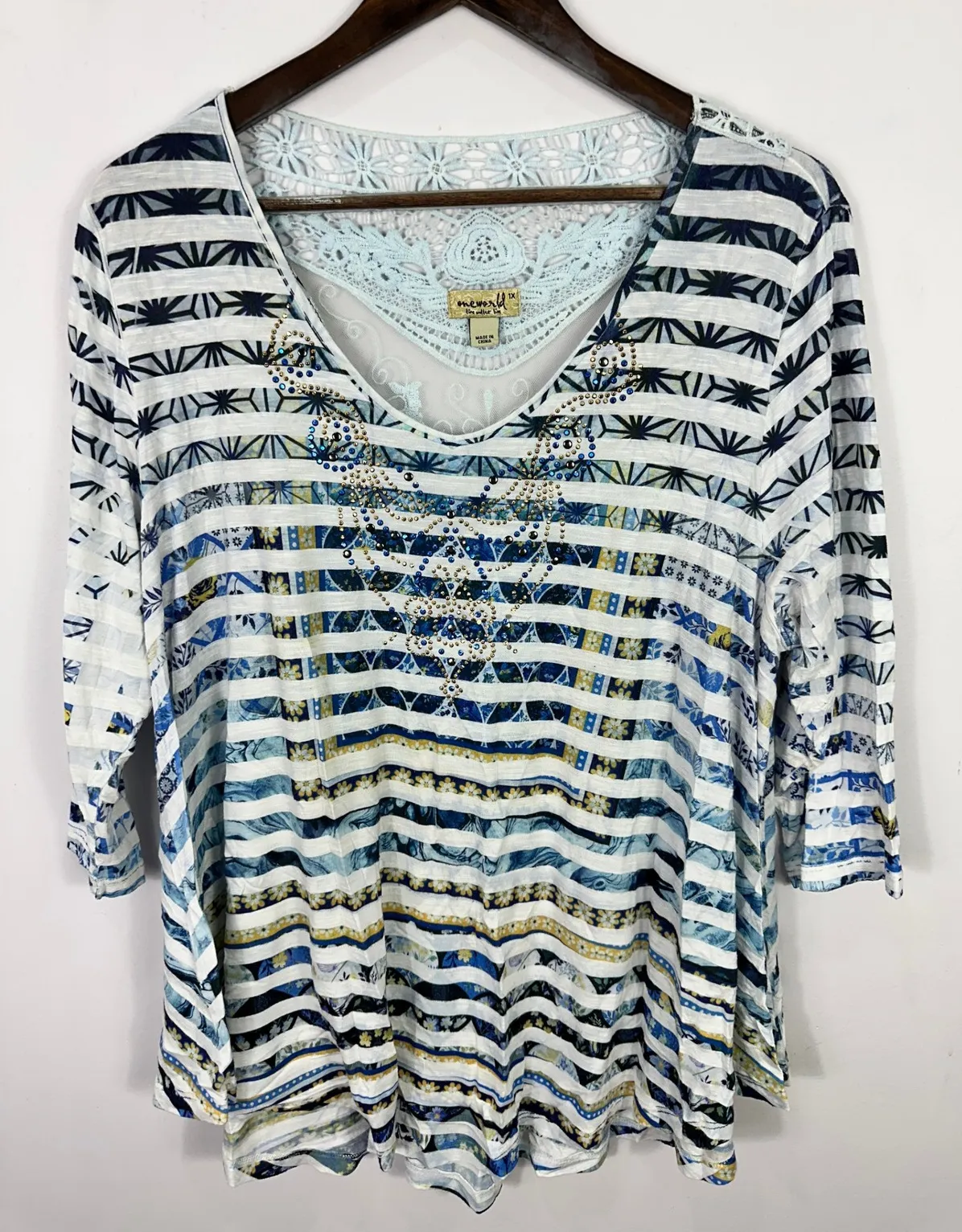 • Size: 1X • Color: Blue, white, multicolor • Neckline: Scoop • Sleeves: 3/4 sleeve • Back: Lace yok... Show more