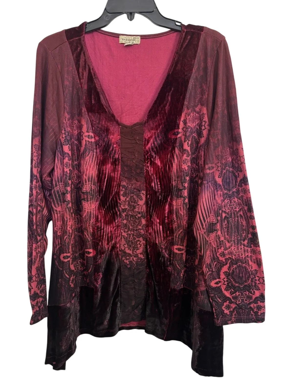 Fairy Grunge One World Women’s Size 2X Burgundy Mixed Media Top Velvet Sections Paisley Patterned Long Sleeve V Neck Asymmetrical Hem Line Polyester Spandex Blend Length 34” Pit to Pit 25” Excellent Condition GG029