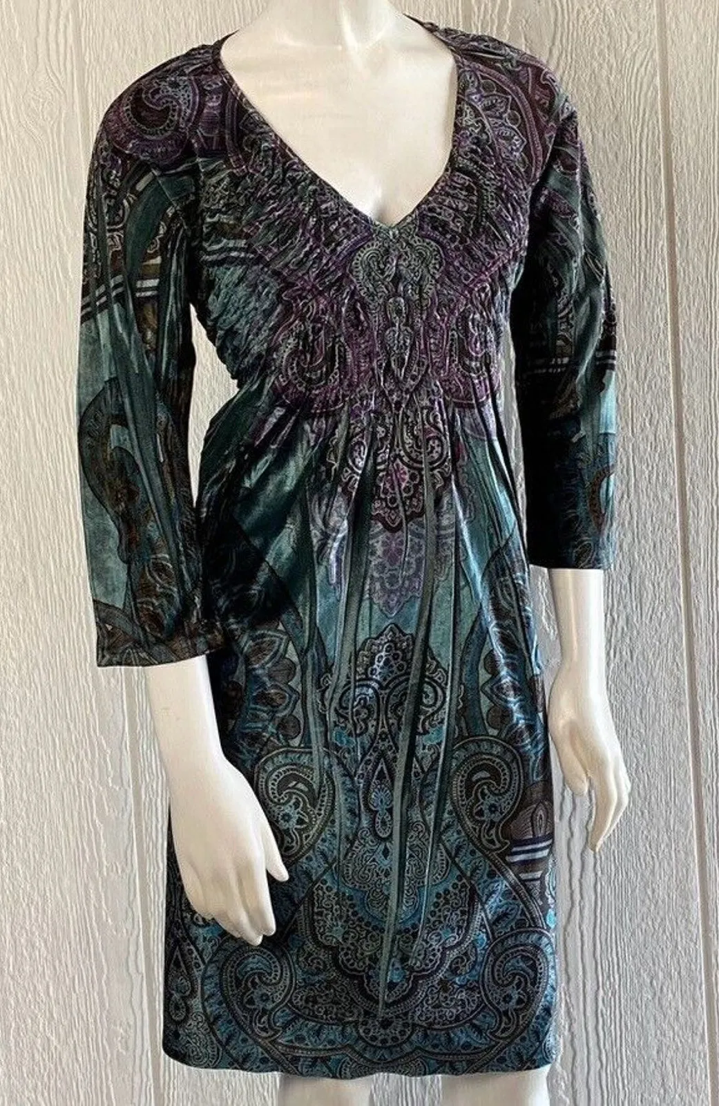 This One World Dress is in Good Pre-Owned Condition. One hole noted. No stains. Please see photos. All items are shipped from a smoke-free home. * V-Neck * 3/4 Sleeve * Pullover Closure * Feels Flowy * All Seasons In Florida 😎🏖️👗 * Color Blue, Green, Purple, Teal * Size Medium * See Photos for Measurements Please review all photos for condition, materials, details and flaws. Flaws will be photographed, highlighted with circles and a brief description of flaw provided. Please feel free to reach out if you have any questions.