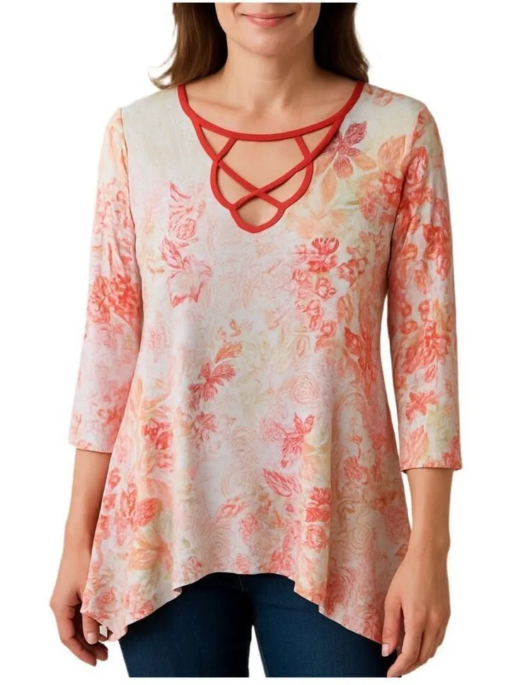 One World size M floral shark bite hem tunic top relaxed fit. Melon and white with a cool v neckli... Show more