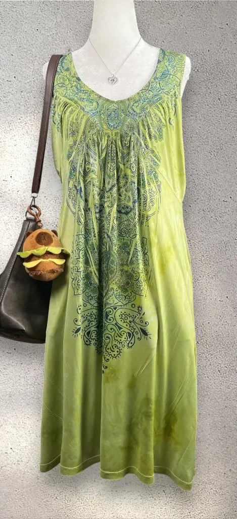 oneworld green boho maxi dress 🌿✨ lightweight, flowy maxi with a relaxed fit that moves beautifully — perfect for summer, vacations, or beachy days. good pre-owned condition with some fading on the rhinestones and light pilling near the hem (see close-up photos) ✧ women’s size large ✧ empire waist with loose, flowy drape ✧ geometric + paisley-inspired boho pattern with rhinestone accents Tags ☆ oneworld, boho maxi, green dress, empire waist, paisley, y2k, summer, vacation, beachy vibes, flowy fit, rhinestone detail, festival style, resort wear