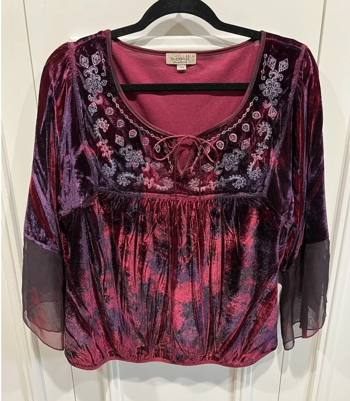 One World Velvet Embroidered Top Size Large Burgundy Purple Fairy Grunge Regal - $35 - From Jennifer