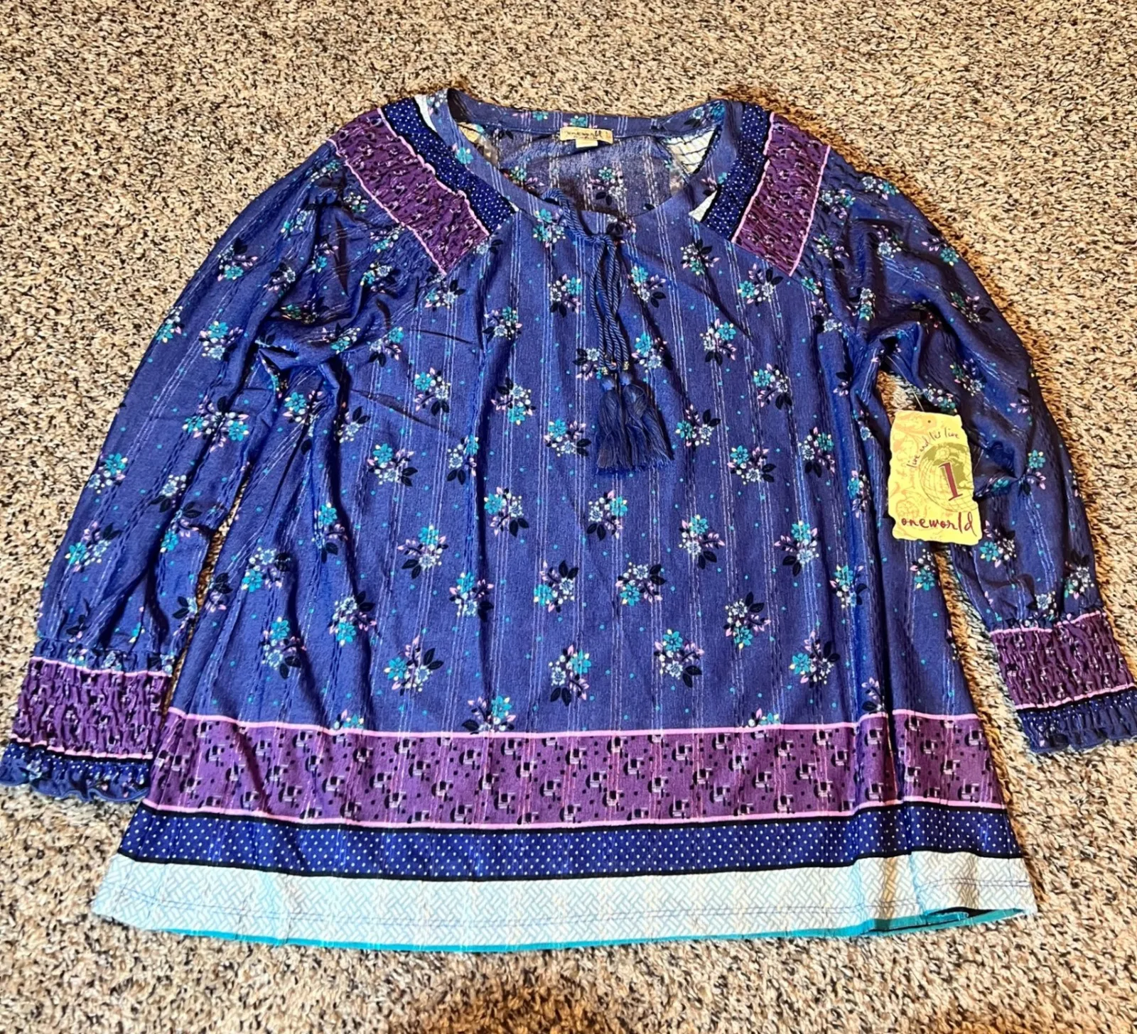 One World tunic top in blue with a vibrant floral and striped pattern. Features a flattering V-neckline adorned with a decorative tassel tie, complemented by ruffled purple accents at the neckline and cuffs. The long sleeves are finished with elasticized cuffs for a comfortable fit. This versatile top is perfect for casual outings, weekend brunches, or a relaxed vacation. Measurements: • Bust: 21 in • Length: 28 in Type: Blouse Department: Women Style: Tunic Material: Polyester Neckline: V-Neck Sleeve Length: Long Sleeve Sleeve Type: Classic/Fitted Sleeve Pattern: Floral Accents: Tasseled Features: Contrasting Trim Fit: Relaxed Fabric Type: Woven Occasion: Casual Closure: Pullover Season: Spring, Summer, Fall Keywords: One World, tunic, bohemian, floral print, striped, tassel, casual, women's fashion, long sleeve, v-neck, relaxed fit, everyday wear, resort wear