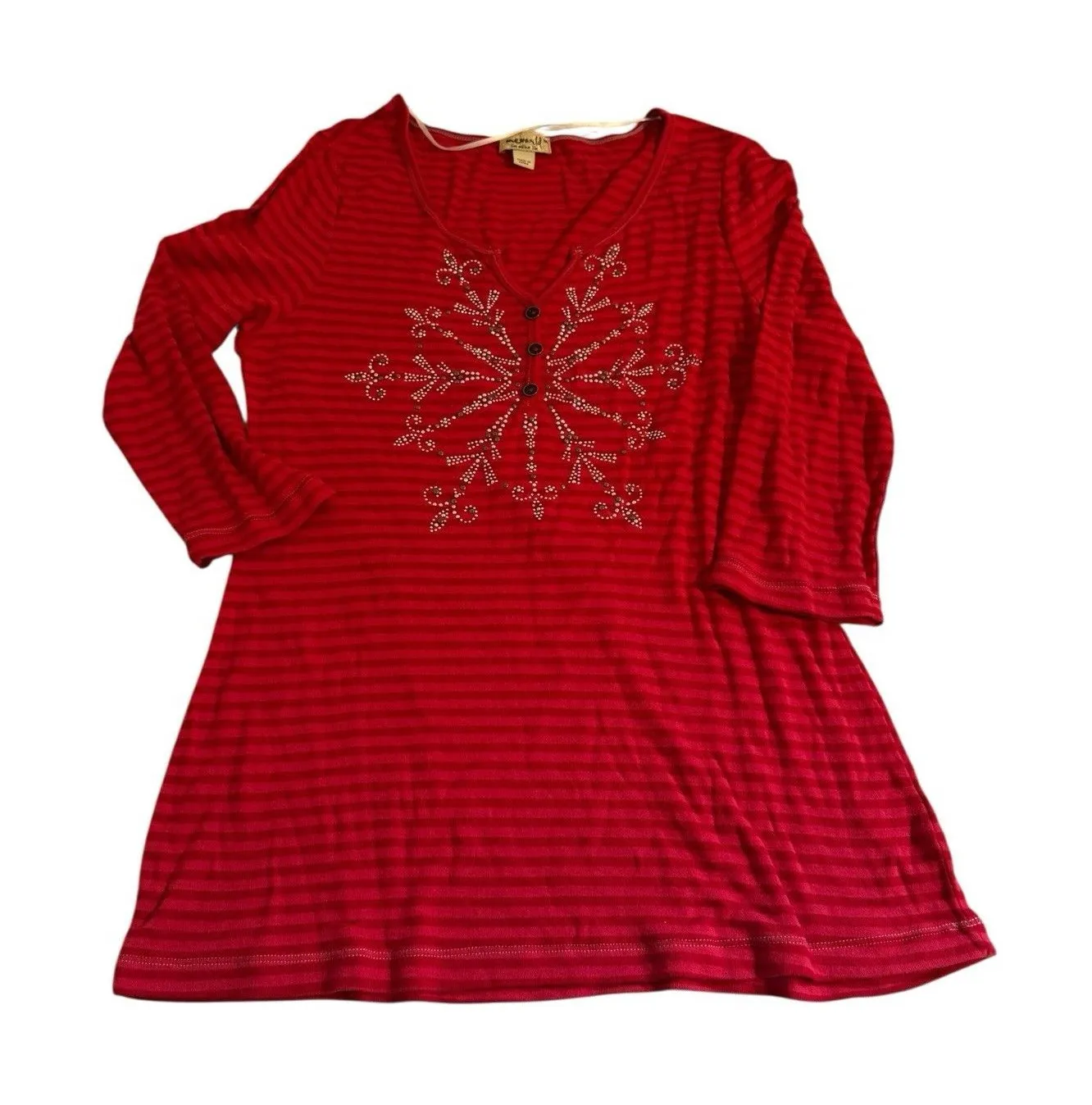 One World Womens Top Size Med Rhinestones Star Vneck Holiday Red Striped Shirt - $16 - From Christina