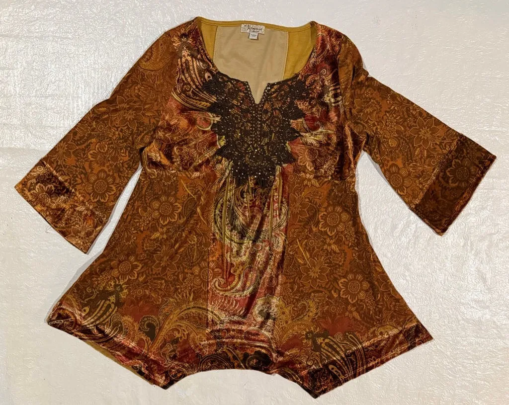 Boho-inspired paisley tunic top featuring crochet lace embellishment at the neckline with subtle sparkle accents. Flowy silhouette with an empire waist, 3/4 sleeves, and a semi-sheer stretch knit fabric. Rich brown, rust, and gold earth tones give this piece a Y2K fairycore / indie aesthetic—perfect for layering or festival styling. • Size: Medium • Stretch fabric • Scoop neckline • Embellished lace detail • 3/4 sleeves • Lightweight & flowy Condition: Pre-owned, gently worn. Please Note: Please see photos for approximate measurements. Unless otherwise stated as new, all items are pre-owned/vintage and may show signs of prior wear consistent with age and use. Any notable flaws or imperfections are clearly shown in the photos. Please review all images carefully before purchasing, as they are part of the item description.
