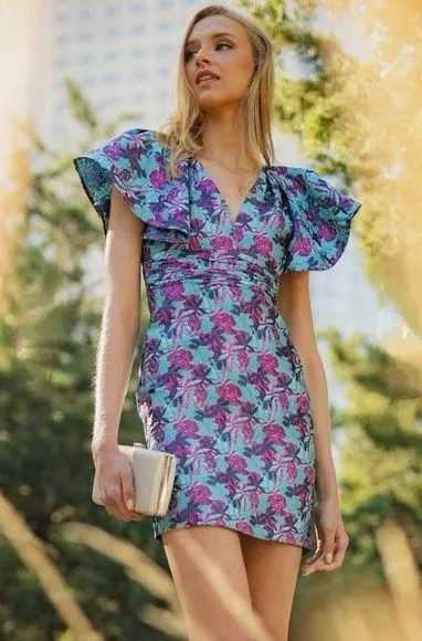 This ornate and unique dress goes heavy on the drip. The flutter sleeves, plunging neckline, metallic accents, and beautiful Teal/Purple/Gold color contrast make this dress a sight to behold, a Stunner for sure!! One33 Social's minidress flaunts a vivid jacquard floral motif detailing with a shiny metallic finish. Cut with a deep V-neck. This piece features ruffled short sleeves. V-neck Ruffle short sleeves Sashed waist Concealed back zip closure 65% polyester/20% metallic fibers/15% nylon Dry clean Imported SIZE & FIT About 34.5" from shoulder to hem Model measurements: 5'10" tall Model is wearing a US size 4 Excellent like new condition Pit :19”(38) Length:35” Waist : 15.5”
