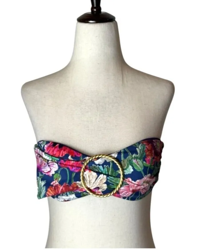 Unleash your inner garden goddess with this bandeau top that's more floral than your grandma's wallpaper. Who needs a bouquet when you can wear one? The gold ring adds a touch of bling, because why not be fabulous? Features: • Bandeau Neckline • Gold Toned Hardware • O-Ring Front Details • Hook & Eye Closure • Soft Removable Padded Cups • spring, fall, winter, summer • solid • hand wash • Lined • Nylon & Spandex Blend Condition: New With Tags All offers welcomed! ❤️ Professional seller, smoke free home and same or next day shipping. Like items for price drops. Receive the 30% off bundle discount when you purchase two or more items. Tags: sexy, designer, luxury, beachy, floral, flower, boho, bohemian, festival, cottagecore, bikini, beach, women's swimwear, women's bathing suit, classic, dainty, romantic, classy, simple, elegant, sexy, curvy, swimwear, swim,Islands, Islandwear, Aloha, Tropical, Beachwear, Sports, Swim, Summer, Swimwear, Surf, Paddle, Surfing, Bodyboarding, Swimming, Ocean, Pool Party, Bathing Suit, Swimsuit, NWT