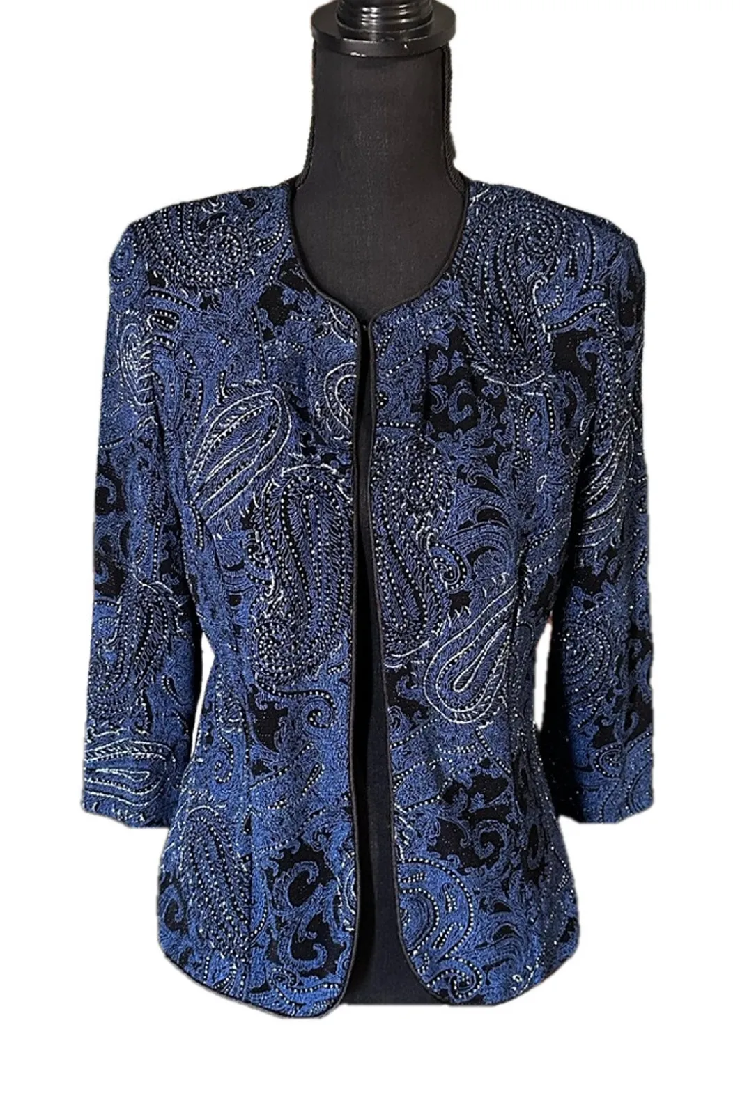 Eye-catching Onyx Nite long-sleeve jacket/cardigan in a black and blue paisley design with subtle glitter accents. Flowy, lightweight, and perfect for dressy events or adding sparkle to evening outfits. Size M, gently worn, and in excellent condition — an elegant statement layer with gorgeous shimmer and movement. Keep in mind this item is pre-owned. I will disclose any flaws. Always welcome questions. Always ready to make a deal. Reasonable offers considered. Hook to close No blemishes Light material OSWL41
