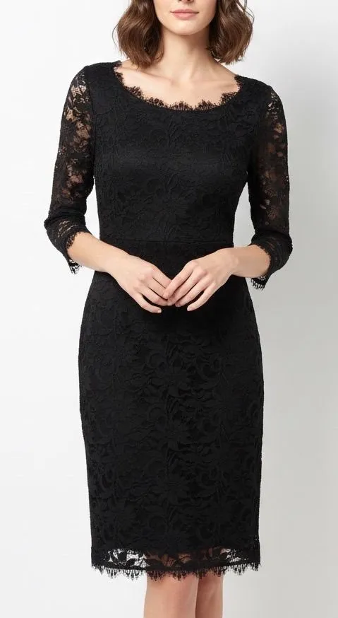 Elegant black lace sheath dress from ONYX Nite. This knee-length dress features 3/4 length sleeves w... Show more