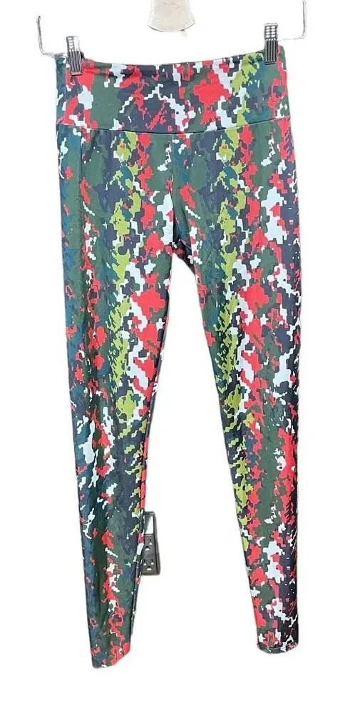 Onzie Digital Pixelated Camo Yoga Leggings in Red and Green These leggings by Onzie have a pixelated red camo pattern that will bring your inner warrior to your workout. Made from a full flex poly/spandex, they move with you and feel comfortable. Wide waistband. Size S/M Waist is approx 13" Front rise is approx 9" Inseam is approx 30"