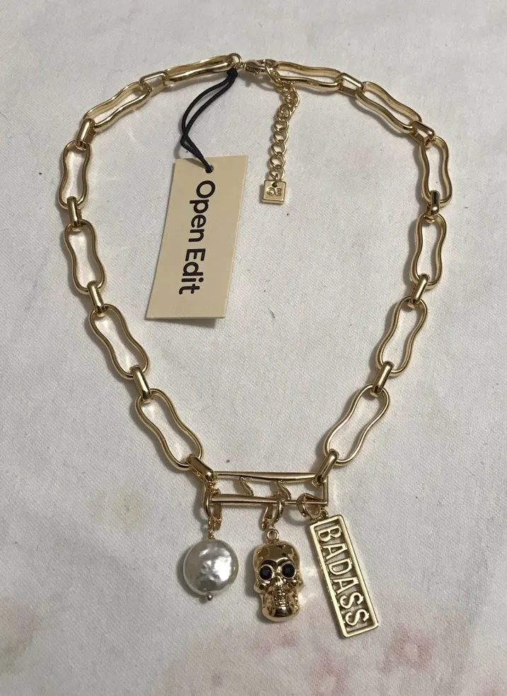 Open Edit Gold Tone Skull Badass Faux Pearl Charm Necklace 14” inches - $26 New With Tags - From Moon