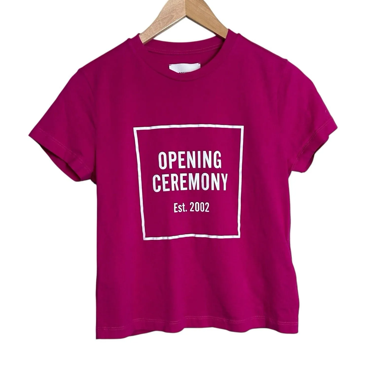 The OPENING CEREMONY Box Logo Tee Shirt in women's size XS is a stylish and comfortable pink top featuring a crew neck and short sleeves. Made from cotton, this basic t-shirt is perfect for casual everyday wear. The designer brand and solid pattern give it a chic and trendy look, making it a great addition to any wardrobe for women who appreciate fashion-forward clothing. Excellent condition