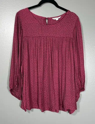 Women's plus size boho peasant top by Ophelia Roe. This dark pink top has a tone on tone subtle leopard print, 3/4 length balloon sleeves, and a seam at the bust to give the top a flowy look. It is 100% polyester. The top is a size 1X. When laying flat it measures approximately: Armpit to armpit: 28 inches Length: 28 inches The top is in amazing shape.