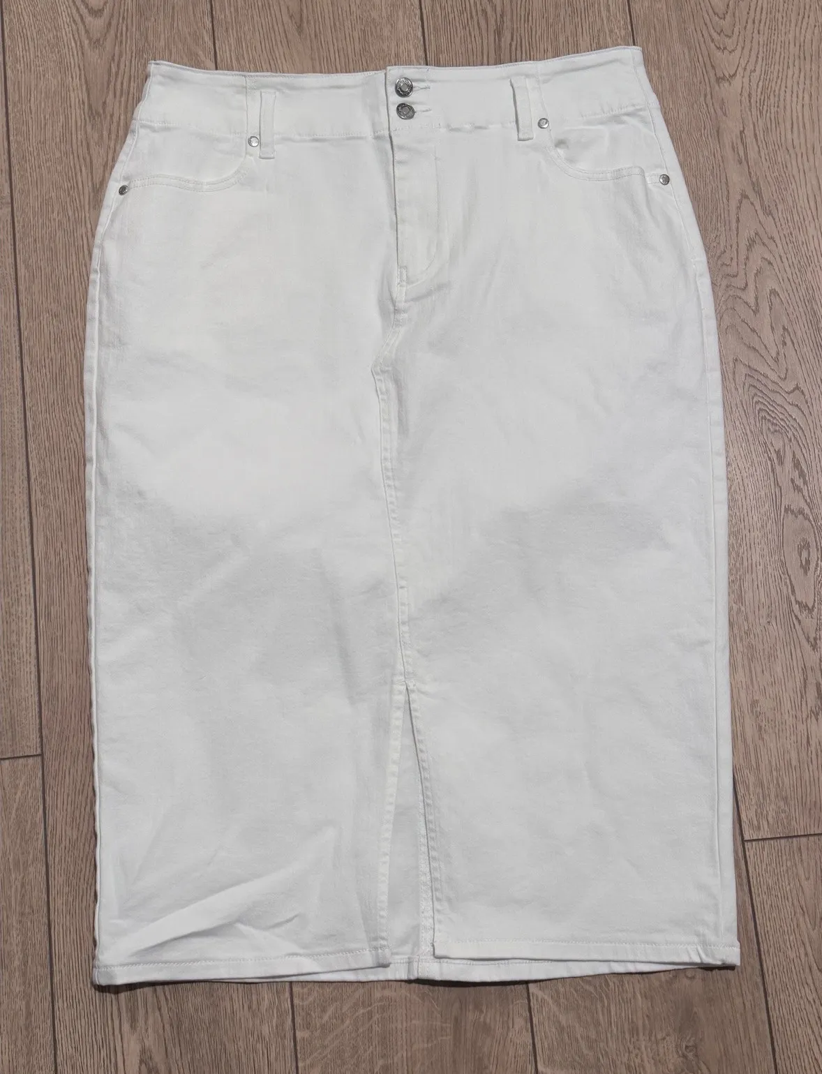 Ophelia Roe Classic pencil skirt in a crisp white denim. Features a flattering midi-length cut, a subtle front vent for ease of movement, and functional back pockets. A versatile piece easily dressed up or down. Ideal for business casual settings, weekend outings, or everyday wear. Condition: New Size: Womens XL Type: Skirt Style: Straight & Pencil Skirt Length: Midi Length Material: Cotton, Polyester, Rayon, Spandex Fabric Type: Denim Features: Pockets, Stretch, Slit Closure: Button Occasion: Casual, Workwear, Business Keywords: white denim skirt, pencil skirt, knee length skirt, Ophelia Roe, XL skirt, casual skirt, career skirt, white skirt, denim skirt, women's skirt, classic skirt, modest skirt, business casual, back vent