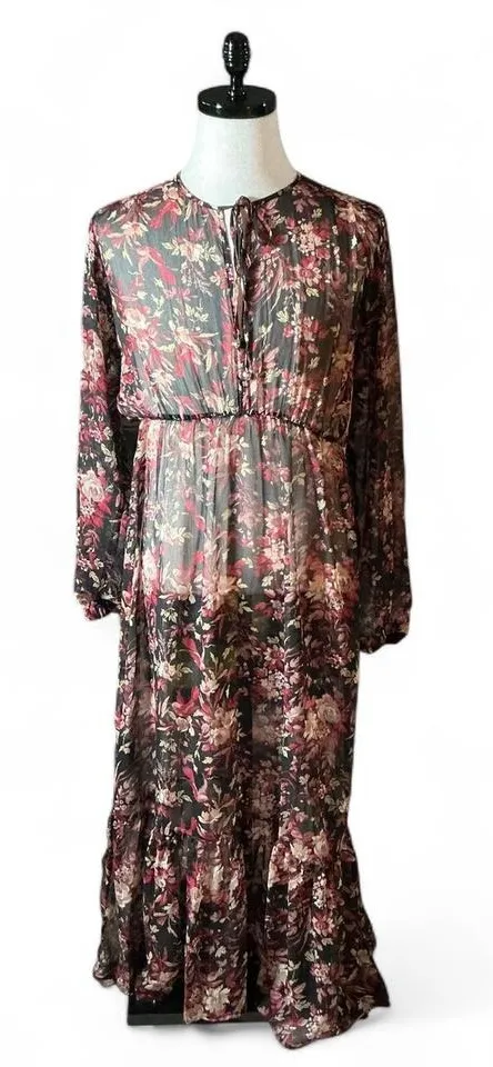 A women's long sleeve maxi dress by O.P.T. featuring a striking floral print. This elegant dress showcases a flattering cinched waist and a flowing tiered hemline. The neckline is adorned with a delicate tie detail, adding a touch of bohemian charm. Perfect for a garden party or a casual brunch. Keywords: OPT, maxi dress, floral, long sleeve, bohemian, feminine, tiered hem, cinched waist, garden party, brunch, resortwear, vacation, lightweight All clothing are cross posted, #Feminine #Retro #Vintage #Ruffle
